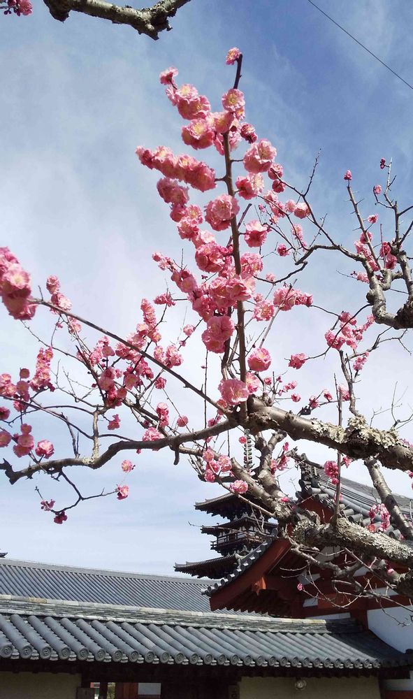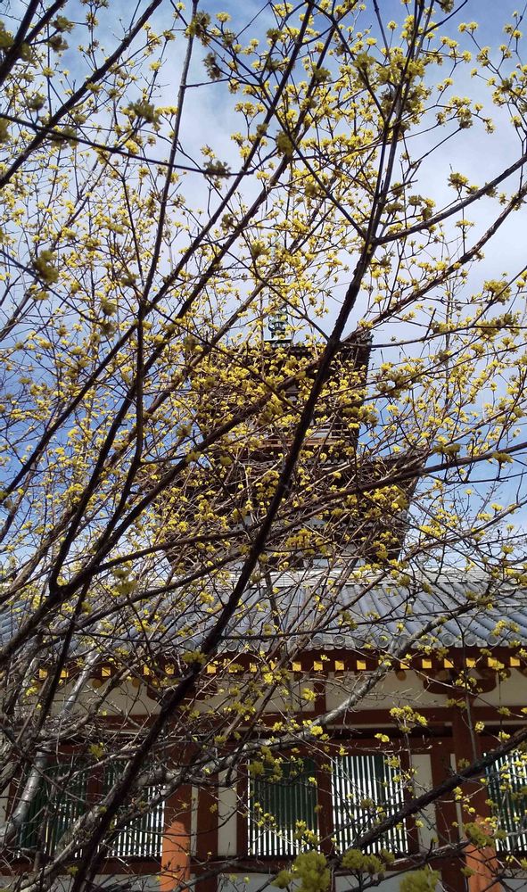 2021年2月25日に薬師寺五重の塔をバックに、今日のお花「サンシュユ」の黄色いお花💛と「梅」のピンク色のお花🌸をパチリ!📸😄