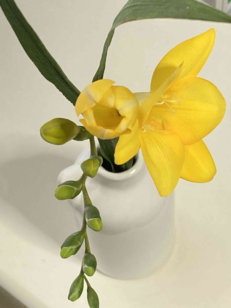 一輪だけのフリージアが借家の狭い空間を、春の香りでいっぱいにしています♡