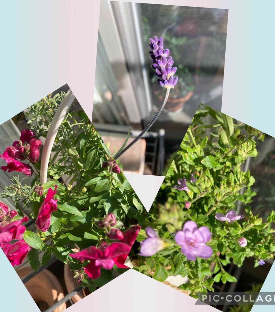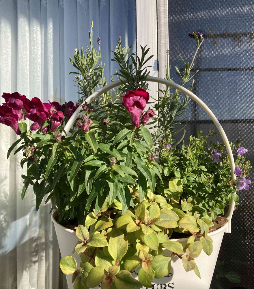 以前に作った小振りの寄せ植えがいいカンジに咲いてきました