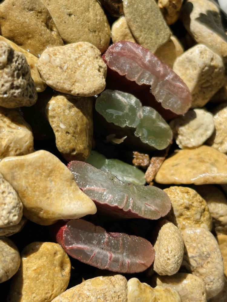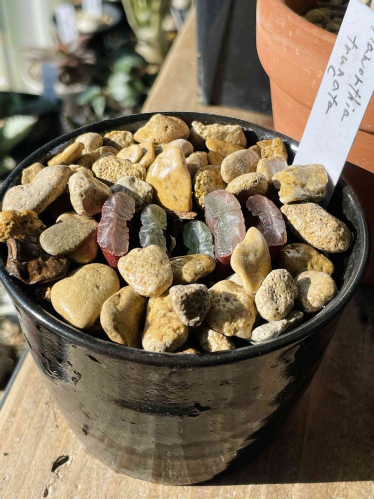 玉扇もそんな南アフリカ出身。現地では砂礫に埋もれて窓だけ出しているらしいですよ。園芸品種としても様々な銘品が作られています。この子は名なしですが紅葉した窓が綺麗なので簡易ハビタットスタイルでグラベルに埋めてみました。