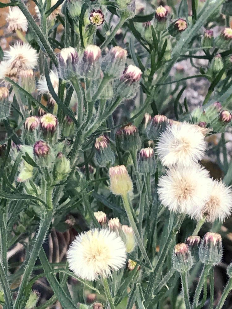 月極駐車場の片隅のヒメムカシヨモギ。綿毛になっているのも蕾も。