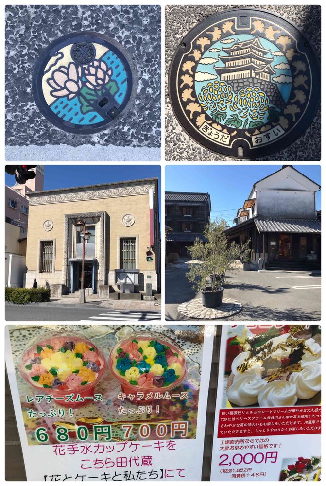 5枚目、マンホールのフタ、大きいやつも小さいやつもお花。レトロな銀行とお店。花手水のスイーツです。