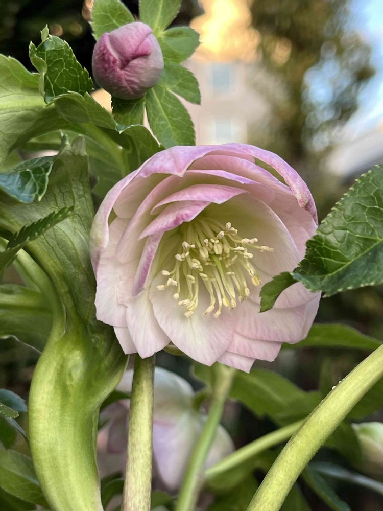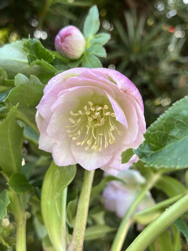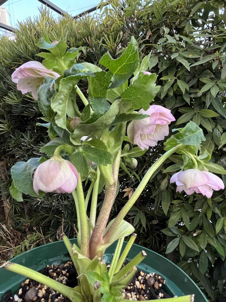 淡いピンクのカップ咲き、お花だけ見ると繊細で可愛い感じにしか見えないけど、若泉さんのクリスマスローズは全体を見ると株がしっかりしていて丈夫で大きくなりそうな感じ ٩(ˊ.ᗜˋ*)و