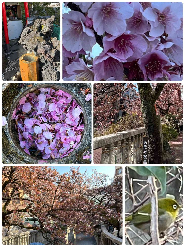 熱海の糸川周辺を散策し、綺麗に咲いている花,近くに寄ってきたメジロ、散った花びらの花手水,熱海桜の基準木等です😄