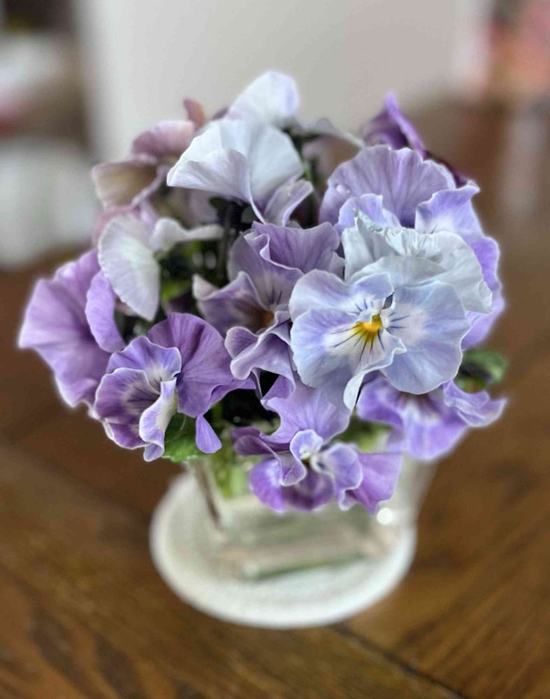 バラは咲き待ちの蕾が一つきりなので、バレンタイン記念は怖いほどキレイなブルーのスミレ達を。