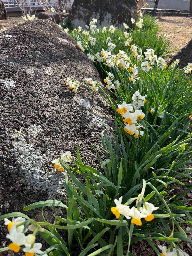 大きな石の傍らに咲いていた水仙と、蝋梅🌼*・