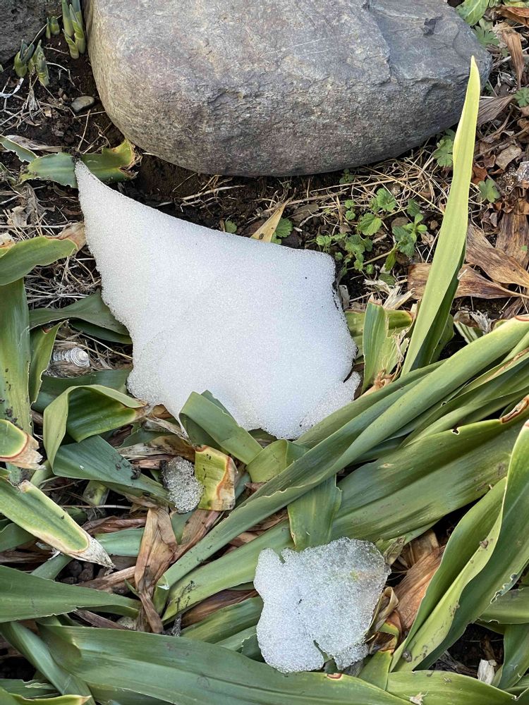 実家の庭にいつからあるのか定かでない石🪨、のそばで南側なのにまだ溶けない雪❄️💦