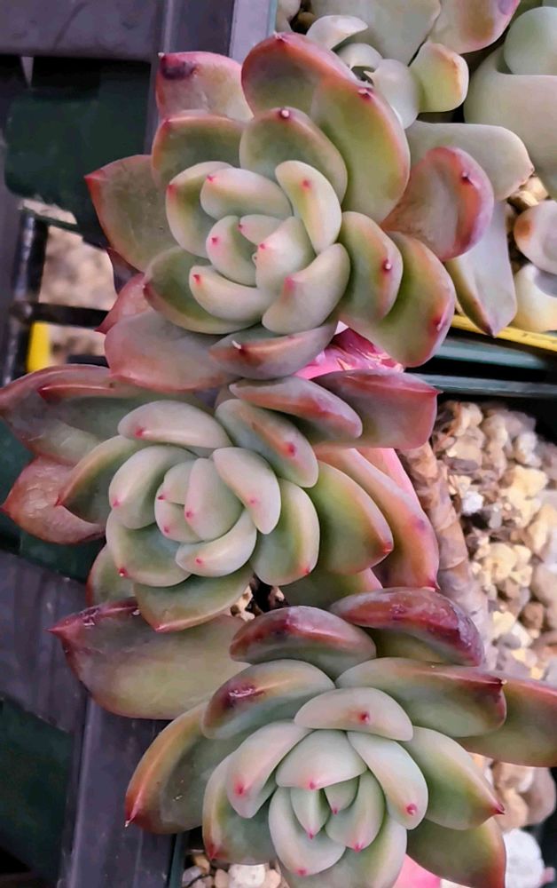 エケベリア・メキシカンサンセットさんの横並び五姉妹さん(写ってないけど他に2姉妹繋がってる)😻🤍💚🩷