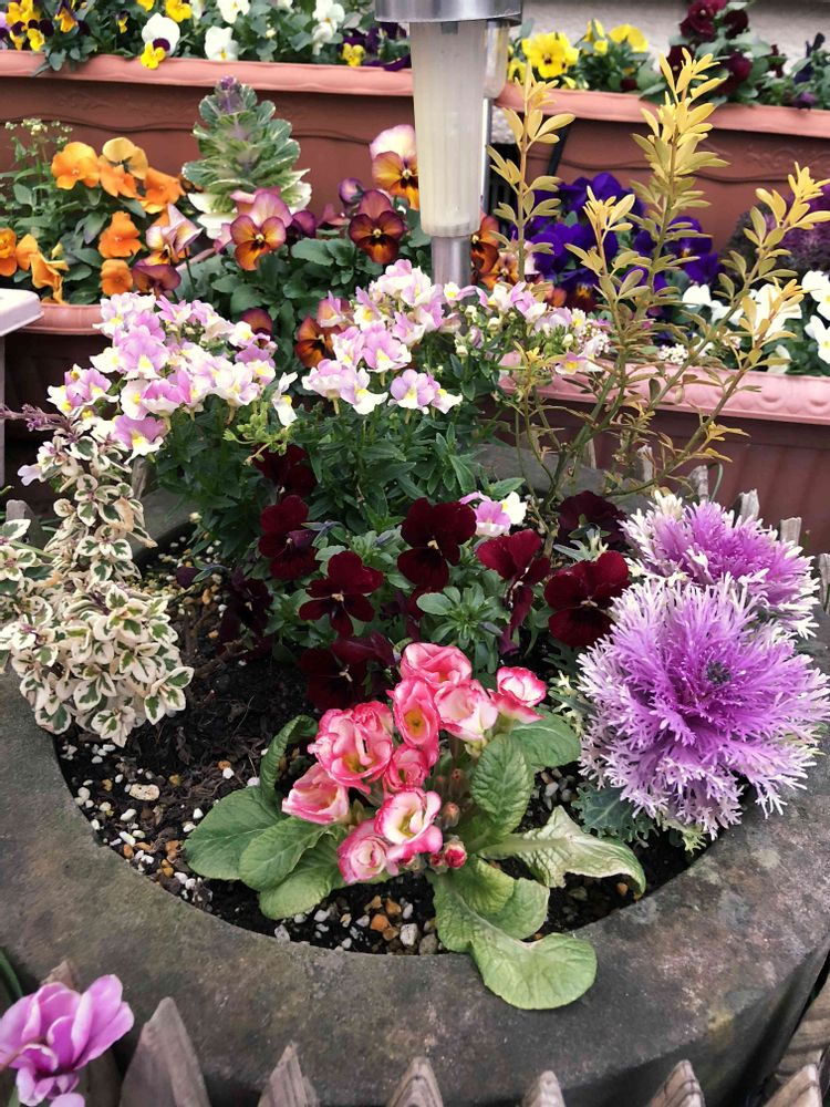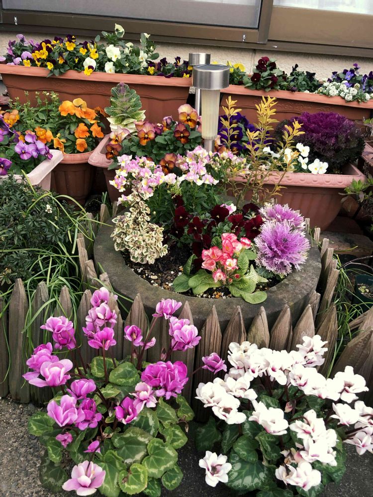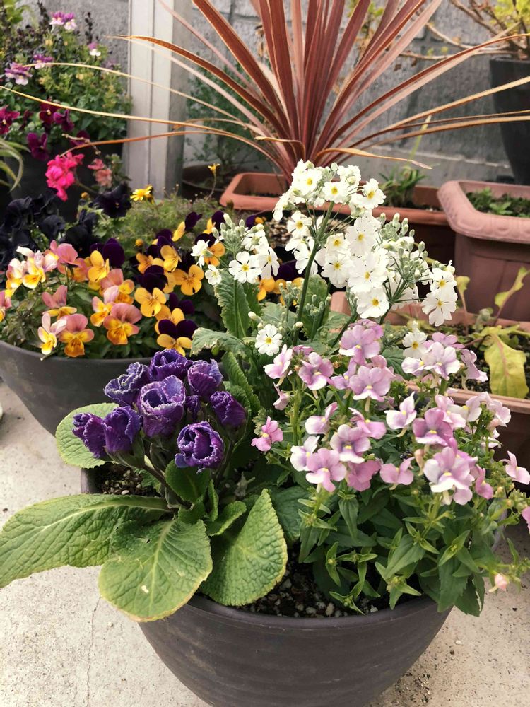 濃紫色🪻のバラ咲きプリムラジュリアン一番好きかも💕🎶グッと引き締めてますよね‼️私は昨年バラ咲きプリムラジュリアンを⭐️だったので😅💦こんなに生き生き育ててもらってジュリアンさんも喜んでますよ🎶寄せ植え達も色や高さのバランスもいい感じ👍✨とても冬のお庭とは思えない華やかさです🥰