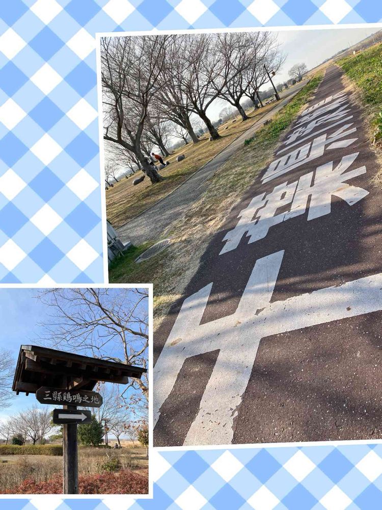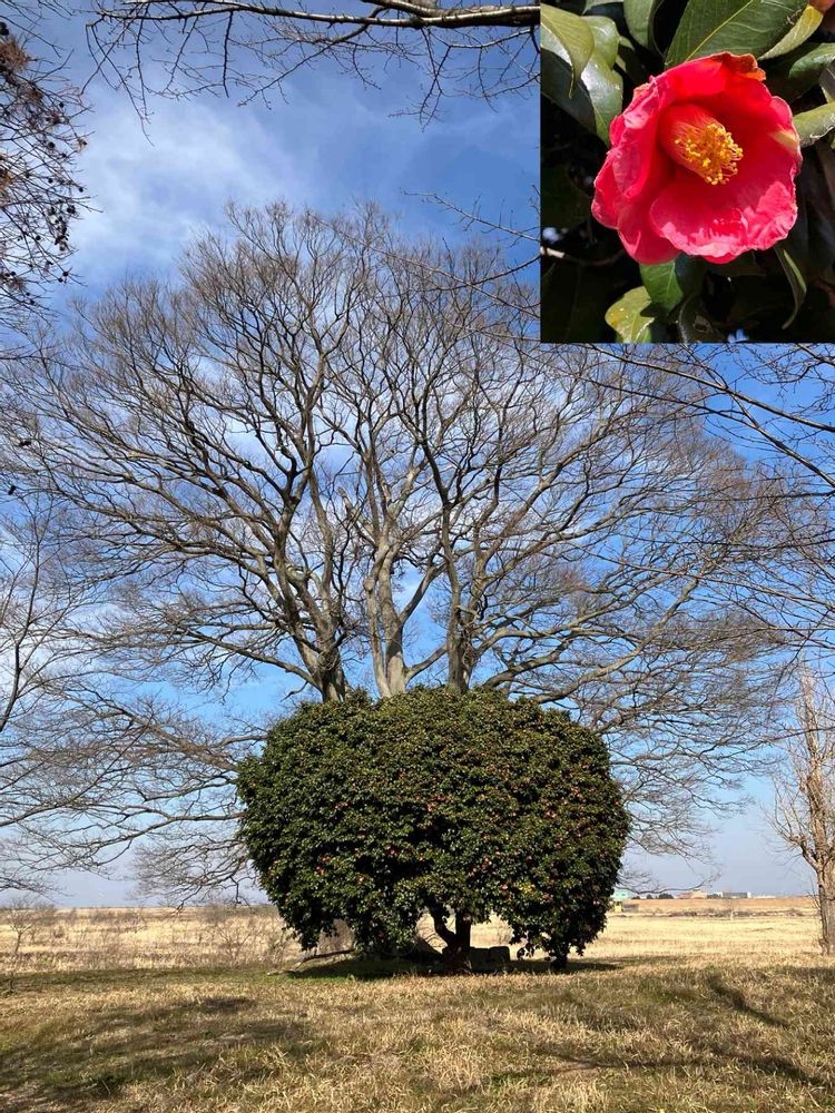 椿の大木 (昔はコブシの大木がありました) 何の木か分からないけど太い 又戻り関宿にこにこ水辺公園で三縣鶏鳴之地(埼玉県の堺に近いためこの辺に泊まった旅人は明け方この三県で鳴く鳥の声を聞く)石碑は撮らず案内板のみ