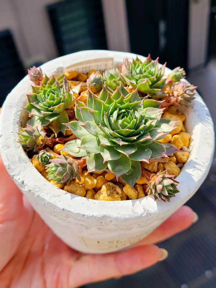 趣味の園芸📖だったかな( -_・)?寒い地方のお庭の一角がセンペルさんとセダムさんで作られてたのを見た気がする……それから鉢ごと外に放置するようになったわ!