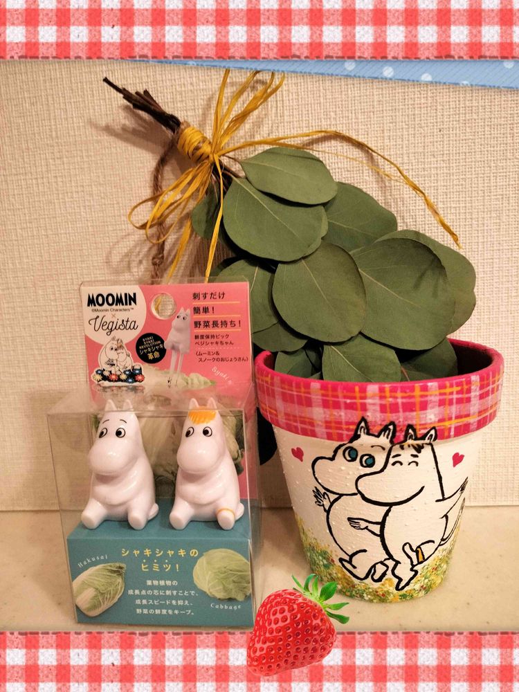 手描きリメ鉢はムーミン&スノークのおじょうさん 🍓はスタンプ🤭🤭🤭