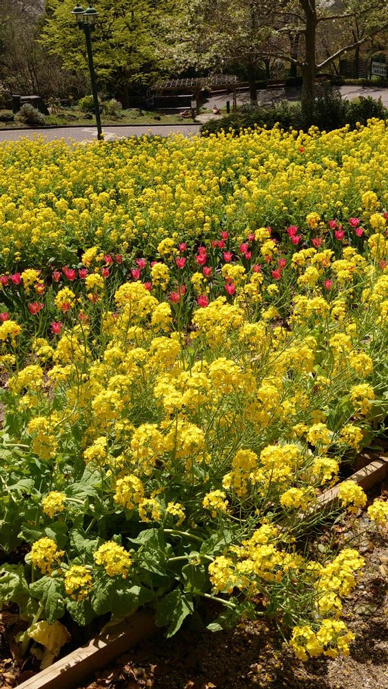 菜の花と桜🌸のコラボはよく見ますが、菜の花と赤いチューリップ🌷はあまり見かけないですね。