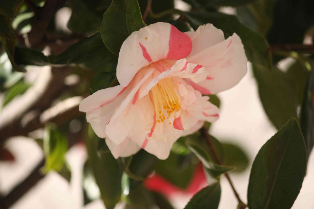 この木は源平咲きなので、奥に見える濃ピンク色の花とは同じ木なんです。