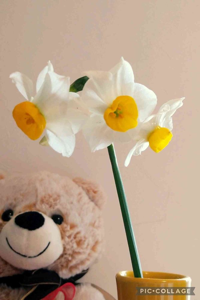 花壇のスイセンが倒れていたので連れて来て花瓶に挿しました💕