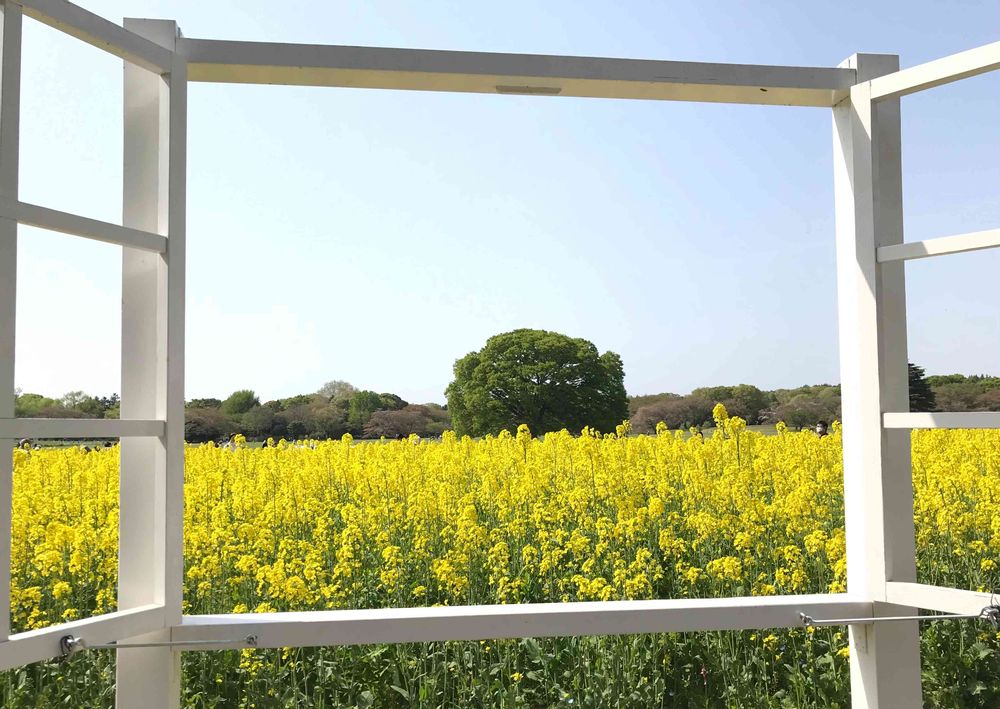 昭和記念公園の、菜の花畑です♪フレーム🖼に合わせて🤳🏻真ん中の巨樹は、シンボルツリーのケヤキ🌲です☺️🥰(2023.4)