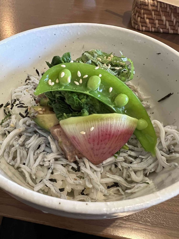 マグロは梅肉合えにしてあって、刻み青紫蘇がシラスの間に入ってました。これがいいアクセントで😊