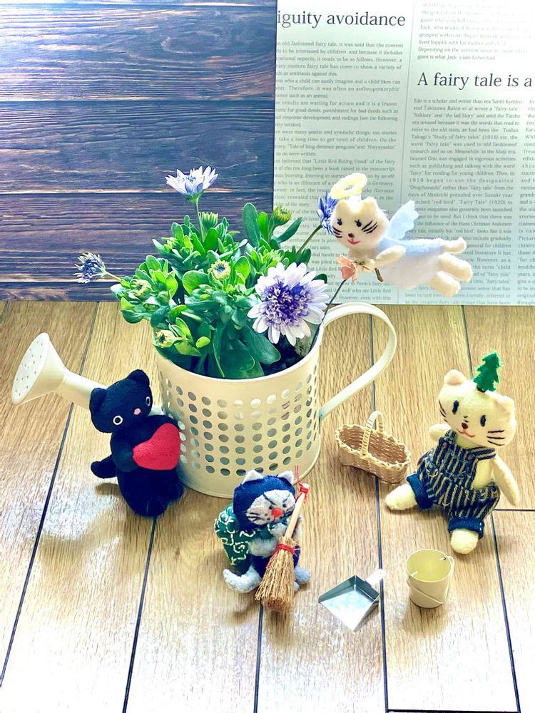 頭に杉の木🌲が生えている子がスギにゃん、唐草紋様の風呂敷包みを背負った子は泥棒猫ちゃん,そして空を飛んでいるのが白猫エンジェルちゃん👼です😉