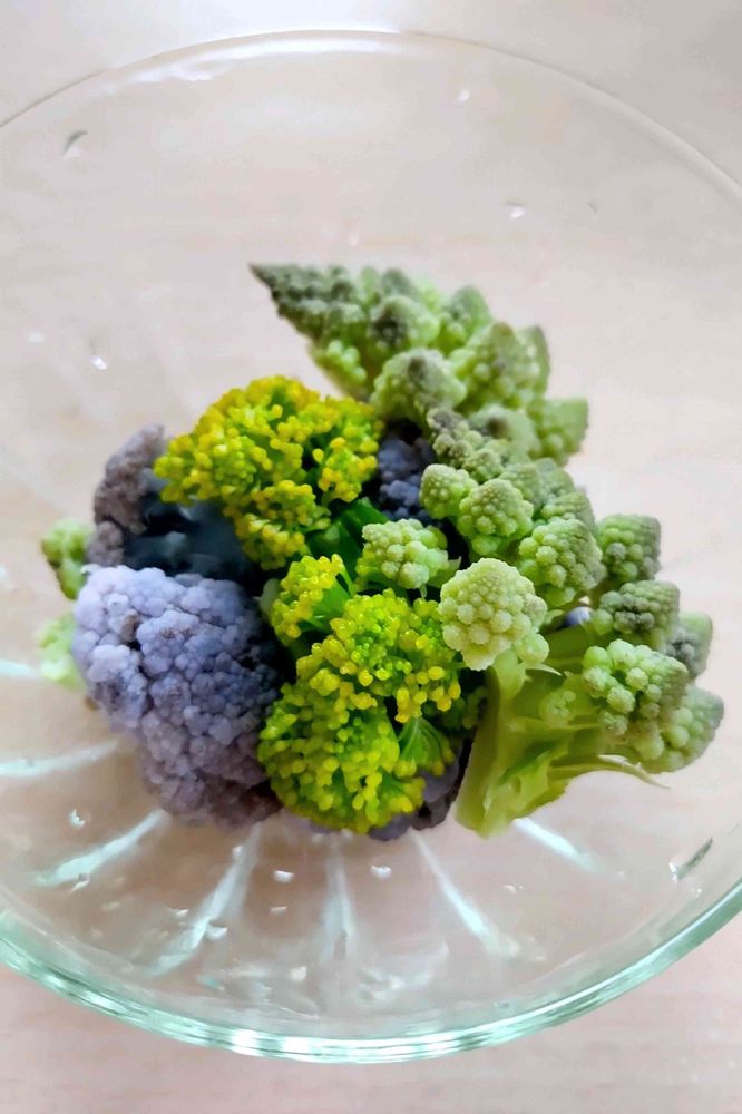 紫カリフラワー💜は、茹でたら少し淡い色になって、まるで鉱石💎みたいで綺麗ですね✨