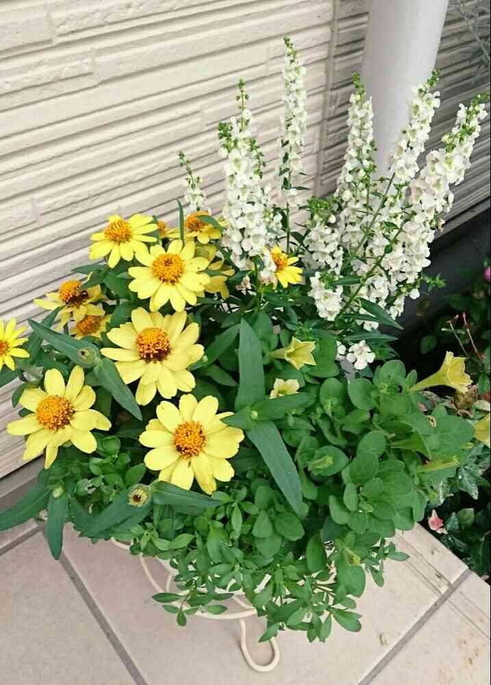 黄色と白でさわやかな寄せ植えですね(*^^*)✨