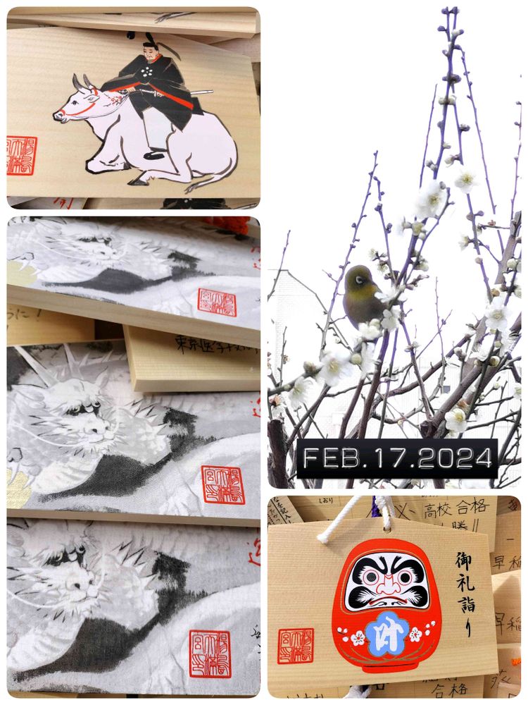 4枚目〜皆様にご利益ありますように縁起物絵馬と梅の蜜を吸うメジロちゃん🐦🎶ちょこまか動いて中々撮れませんね💦