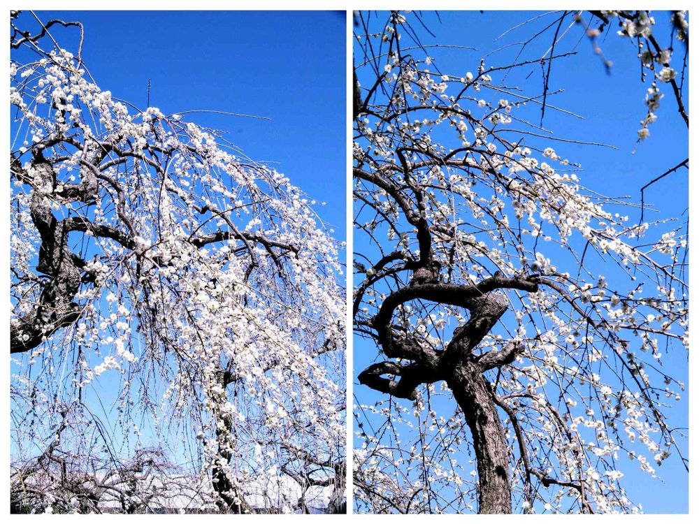 この木は2本とも白梅ですが、ほかに紅梅の枝垂れと紅白の両方が混じった枝垂れが観られます