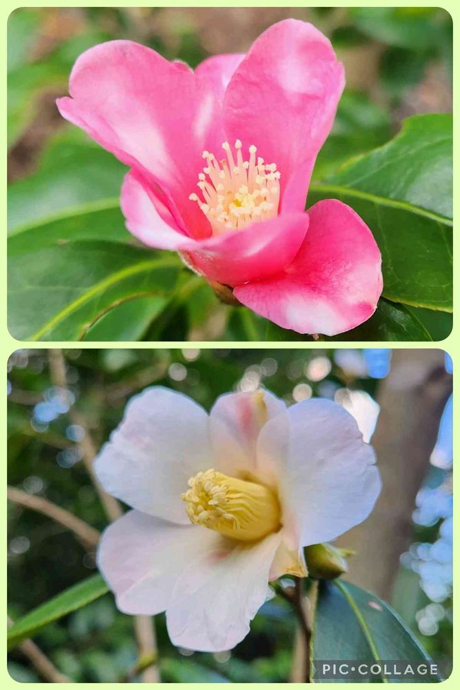 おそらくですが、赤いのは胡蝶侘助、白いのは初雁(別名 昭和侘助)だと思いますよ。