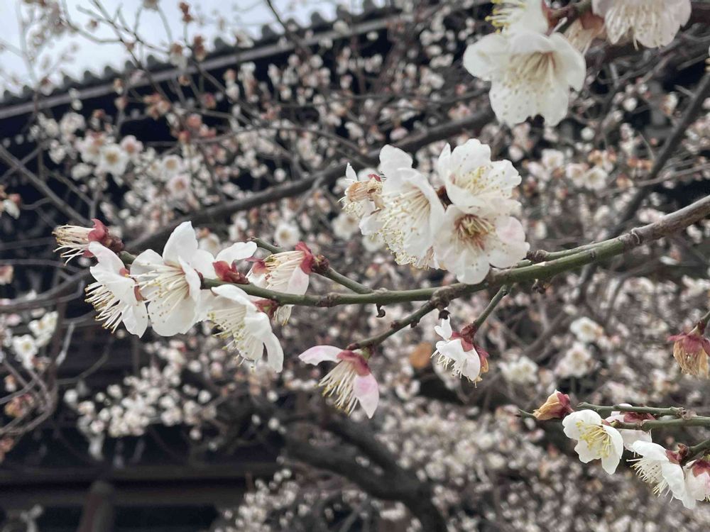 京都市下京区 興正寺(こうしょうじ)三門前に植栽されている紅白の梅の木🌸🤍 ちょうど見頃?🥰🌸🌸