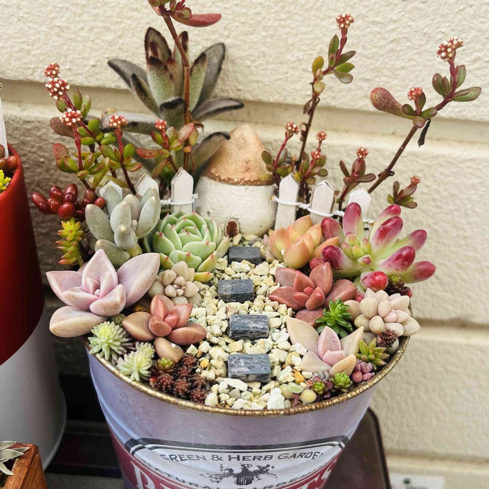 初めて作った時の箱庭寄せ植え、セダムがカリカリになっていたり、伸びすぎた乙女さんでお家の入り口をふさいでしまったりしていたので、少し整え直しました。
