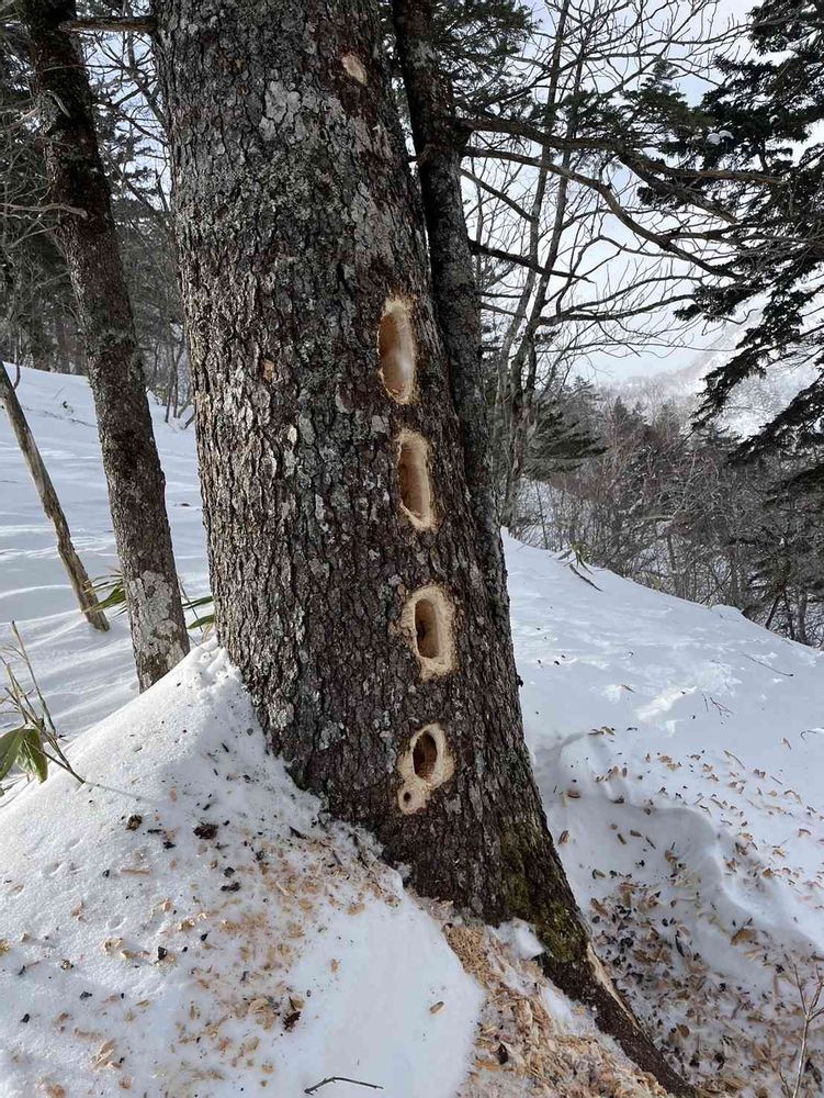 クマゲラの新居 カンナ屑?が雪の上に落ちて!