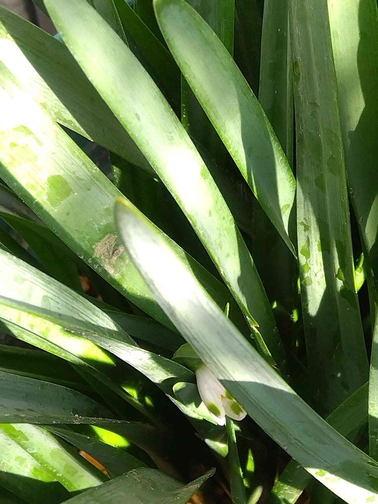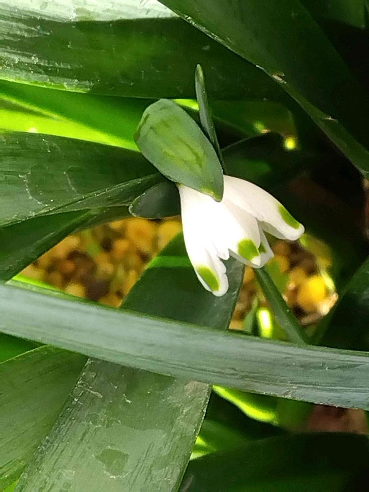 ①②③朝の水やりで葉の中に隠れる様に咲いているスノーフレークの花を見つけました🍃🤍🍃