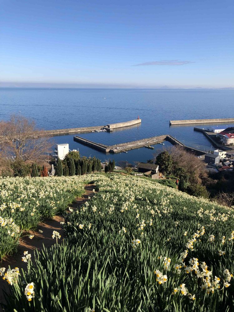 見頃を迎えた水仙畑。 美しい伊予灘
