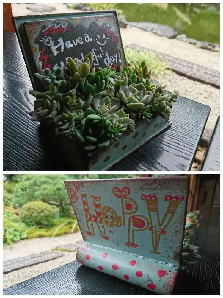 落書きリメ缶に、職場の人から頂いた多肉ちゃんと+おうちの多肉ちゃんを隙間にIN♪✨☺️