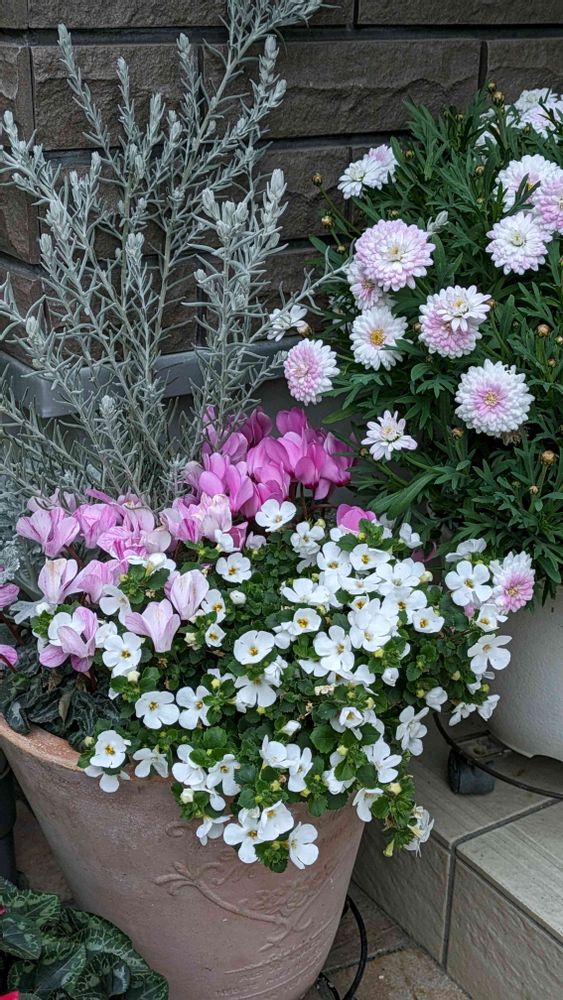 シクラメンは変わることなく咲き続け、バコパは流れるように鉢から溢れ咲き…