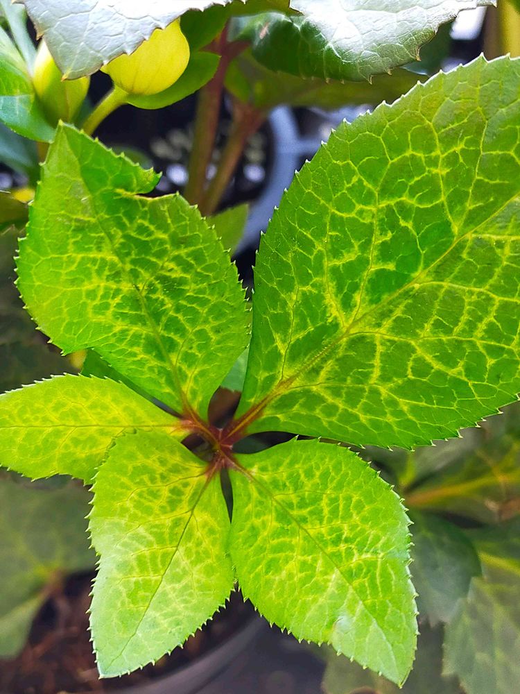 4枚目。しかも、クリスマスローズでは珍しい、葉っぱに斑入りです。斑入りの葉っぱが今後は流行りになると、店員さんのイチオシ。一株で5000円以上もする。流行りに乗りたいが、購入は断念😭