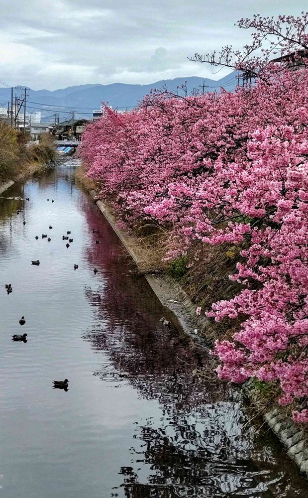 水面に映る河津桜も、本当に素敵ですね 🦆も嬉しそう😊