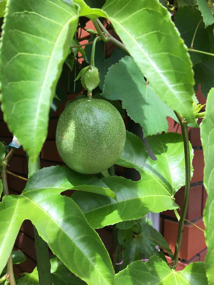 我が家に来て5年になるパッションフルーツです。1年目、たくさん実がつきました。それから2年間全く花が咲きませんでした。昨年、鉢に長い棒を立てて蔓を上に伸ばしたら、花が咲き、たくさん実を付けました。