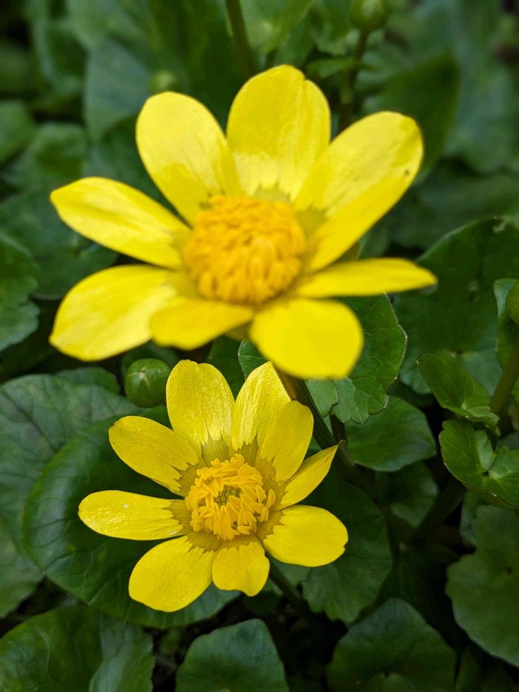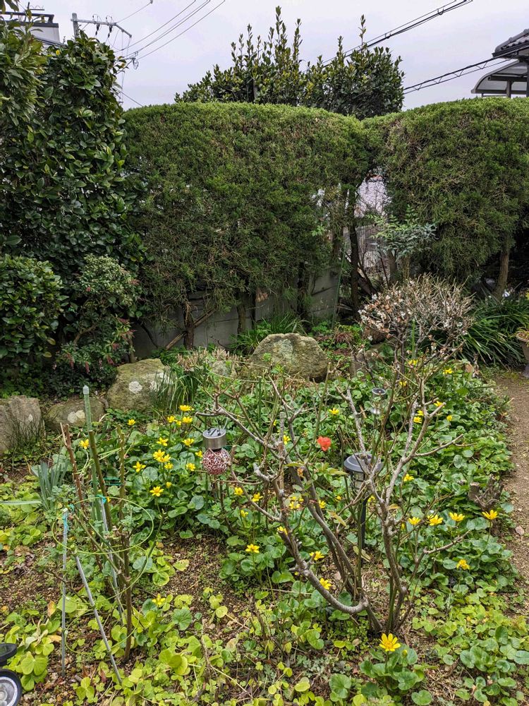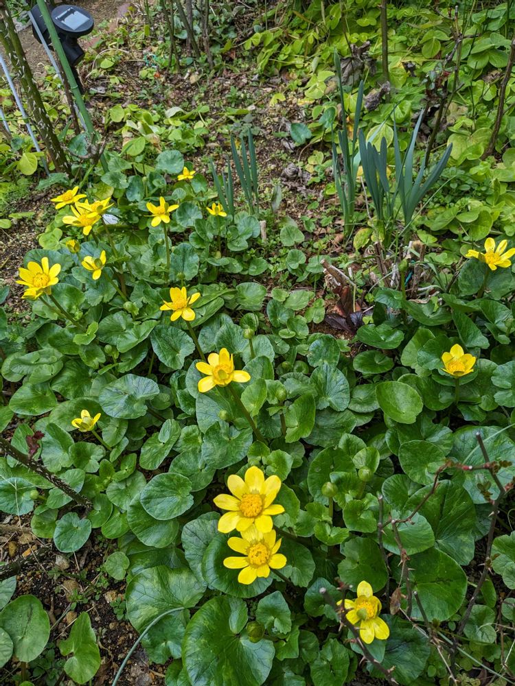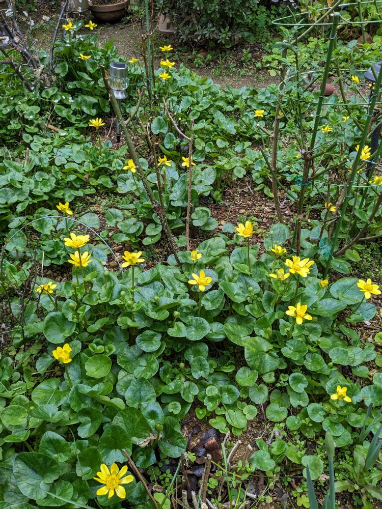 花壇ではヒメリュウキンカが一斉に咲き始めている⤴️