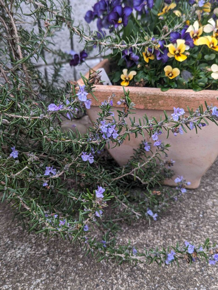 ローズマリーってあるだけでお洒落✨這性や立ち性どちらも良いなぁ(´。✪ω✪。 ` )お花もビミョーに形が違いますね💜可愛い小花がよいです( ´͈ ᵕ `͈ )♡