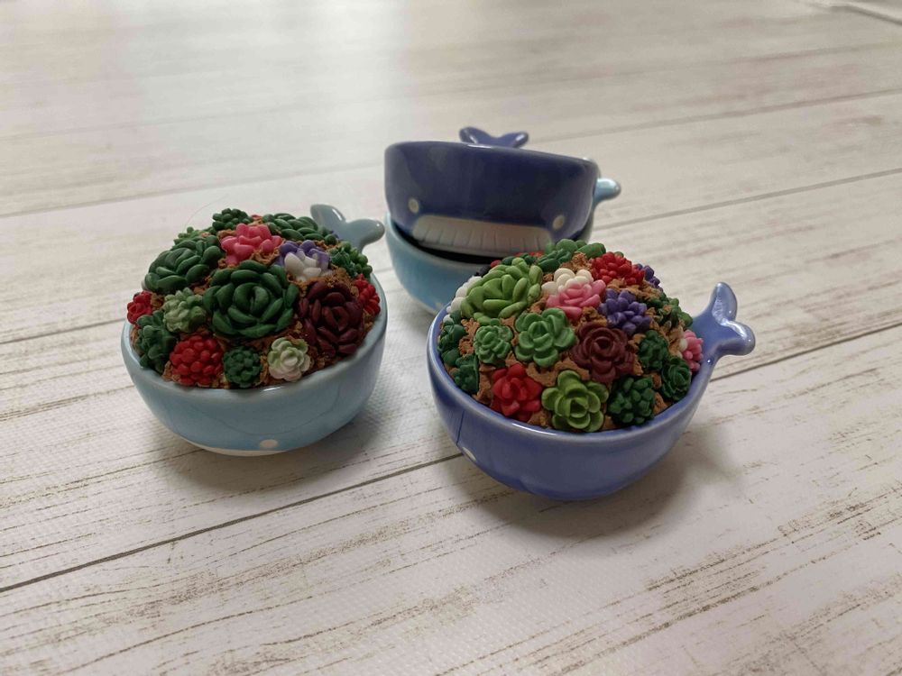 100均の樹脂粘土で、チマチマと型を抜いて作った多肉を植え込みました🥰