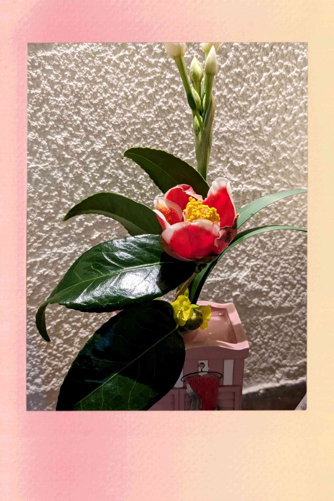 先日我家に来た母から手渡しで一枝もらった椿 庭に咲いていて私にも見てもらいたかったみたいです(*^^*)