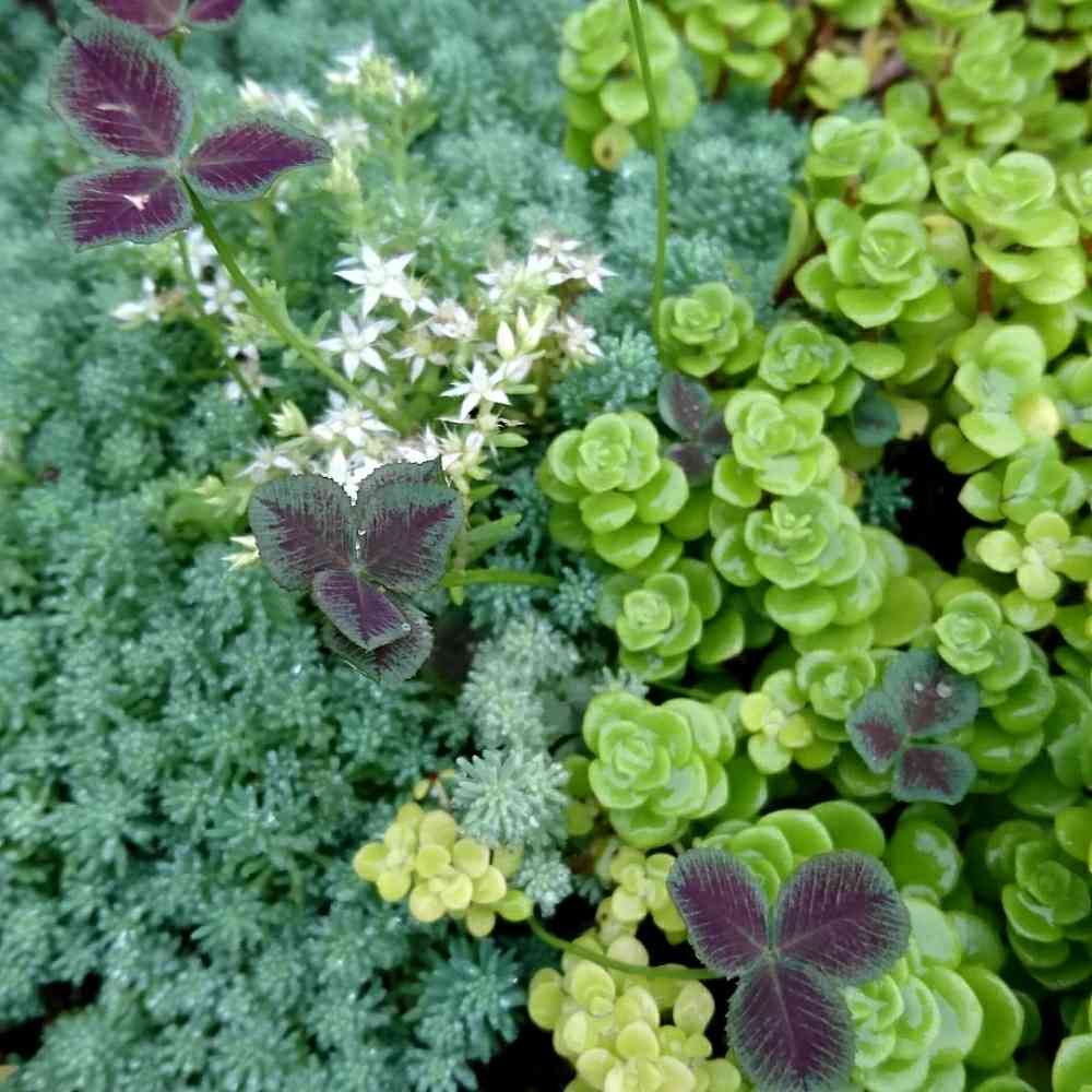 雨に打たれたセダム畑の中のクローバーが可愛い٩(๑> ₃ <)۶♥