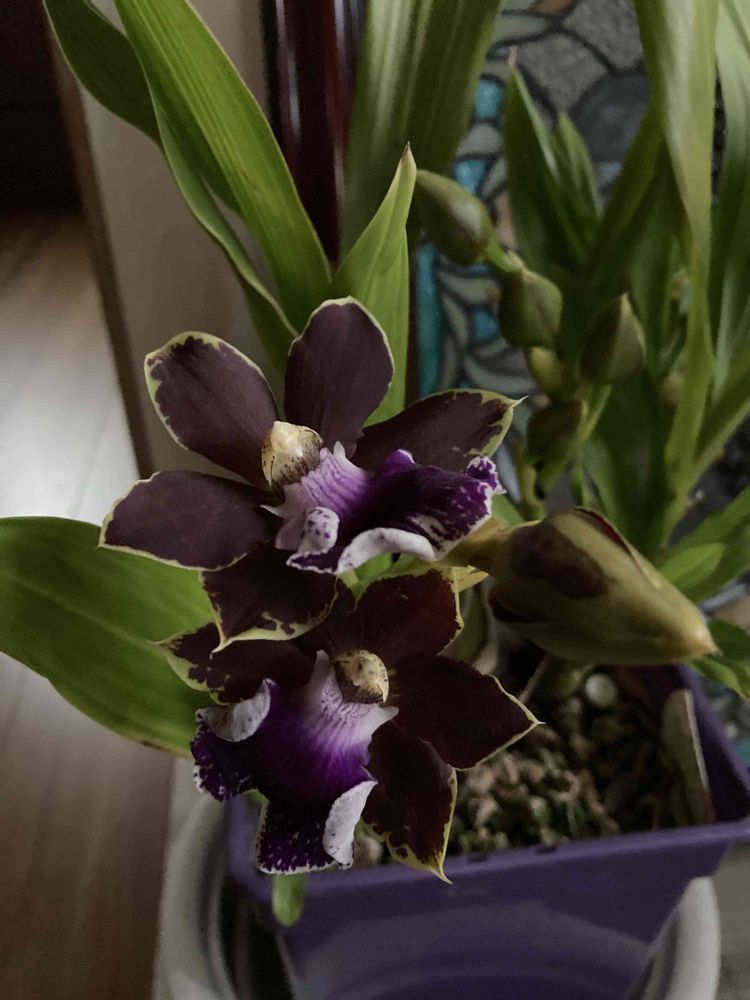 縁側でレース越しの光を浴びて、今年も開花しました💜🤎
