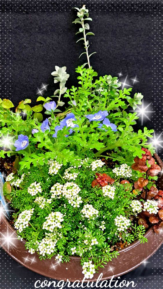 大好きなネモフィラと可愛いフチンシア・アイスキューブの素敵な寄せ植えでお祝いありがとうございます(*^▽^*)とっても嬉しいです💙😍💚😍🤍😍