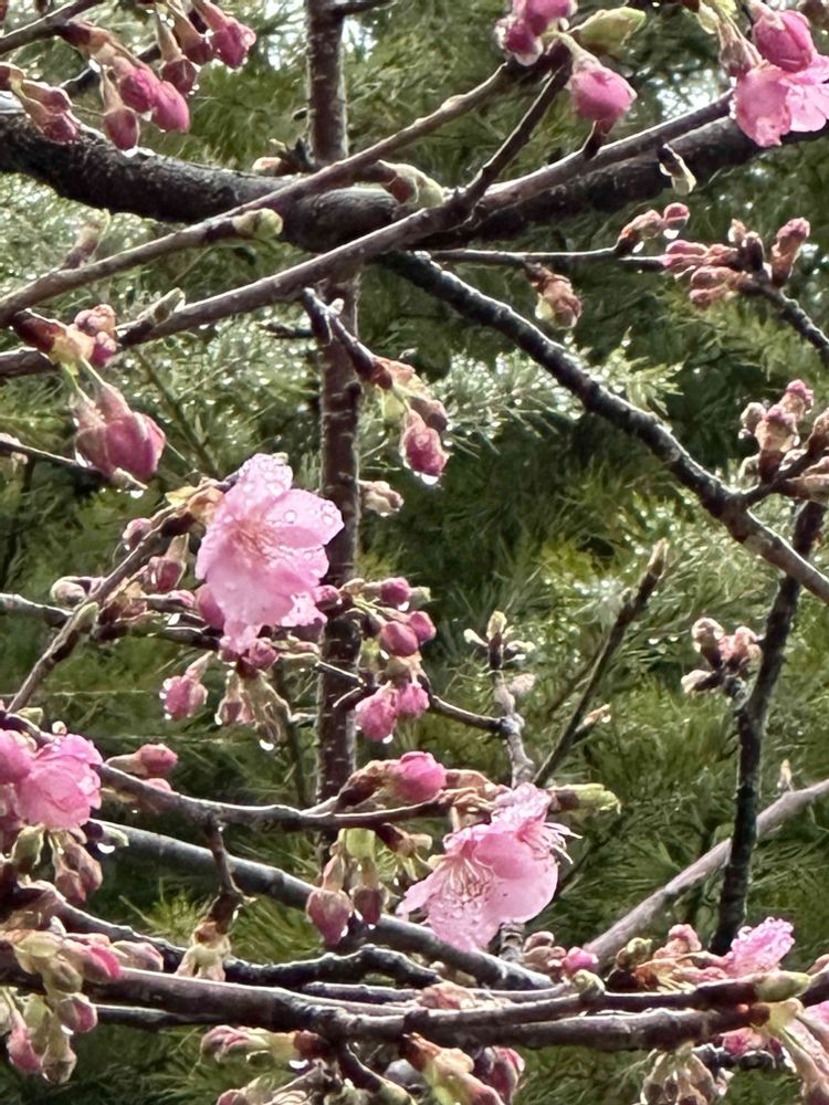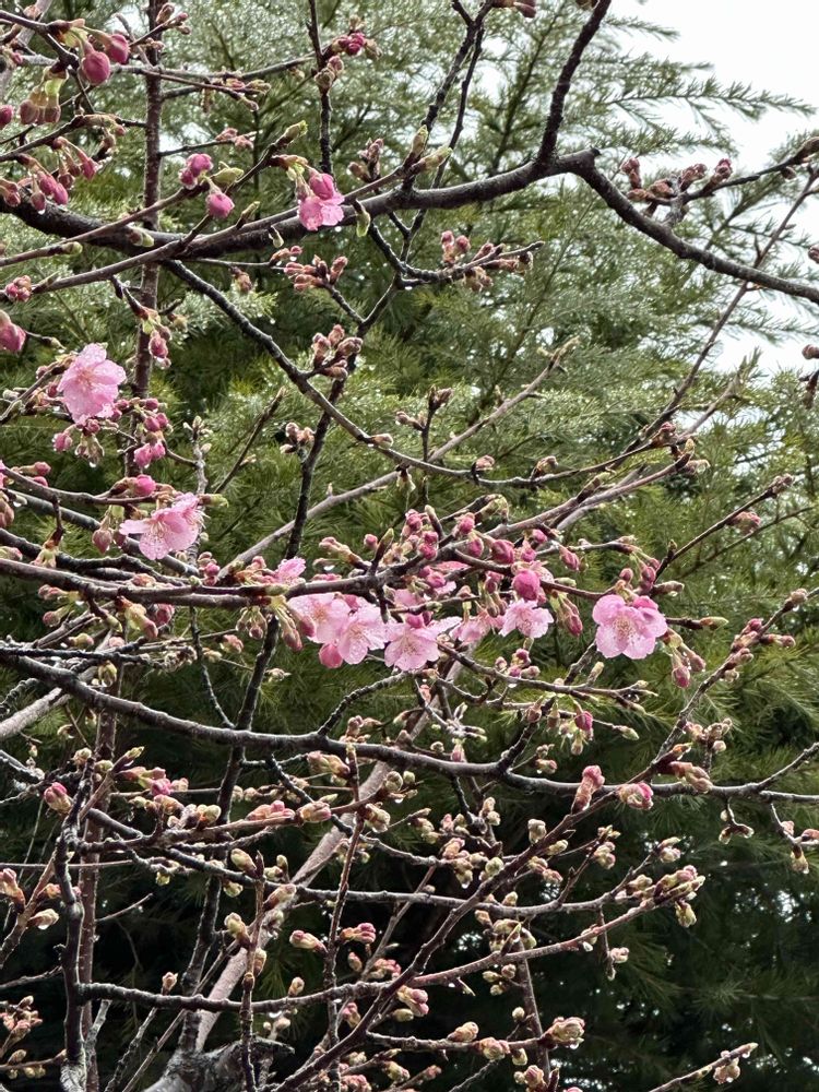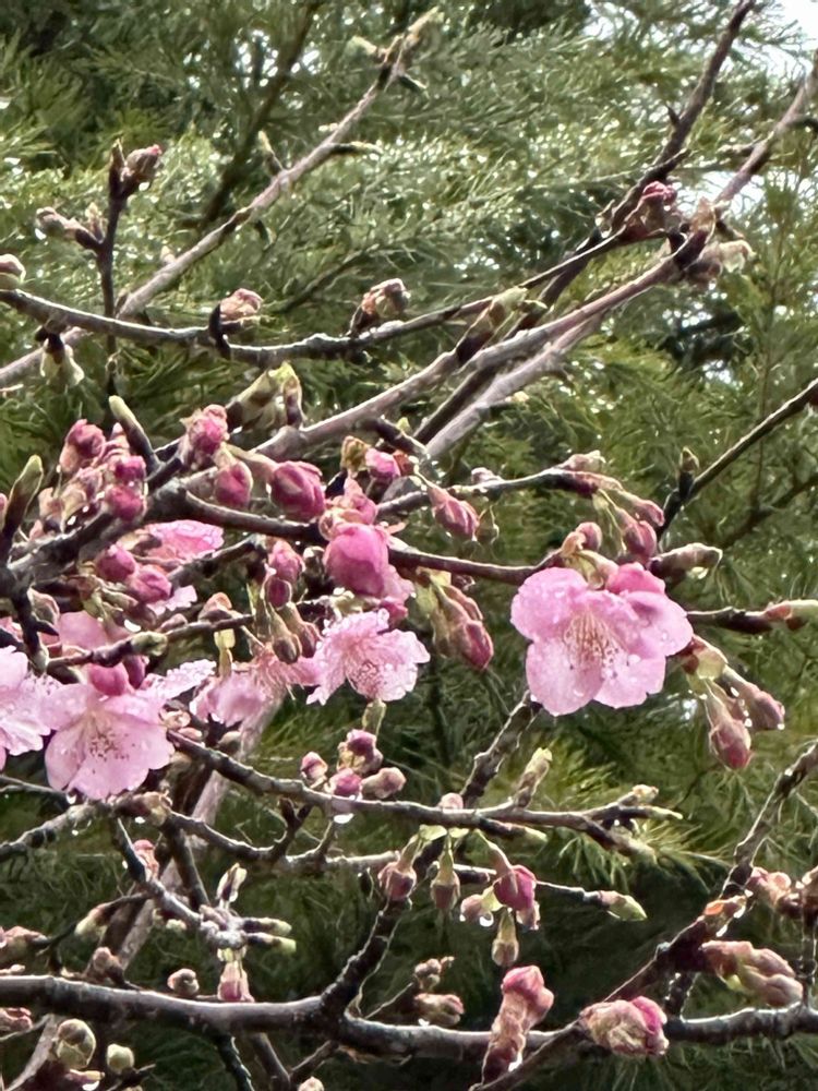 お孫ちゃんのお迎えに行ったら、門の外に河津桜らしきピンクの桜が咲き出していました!