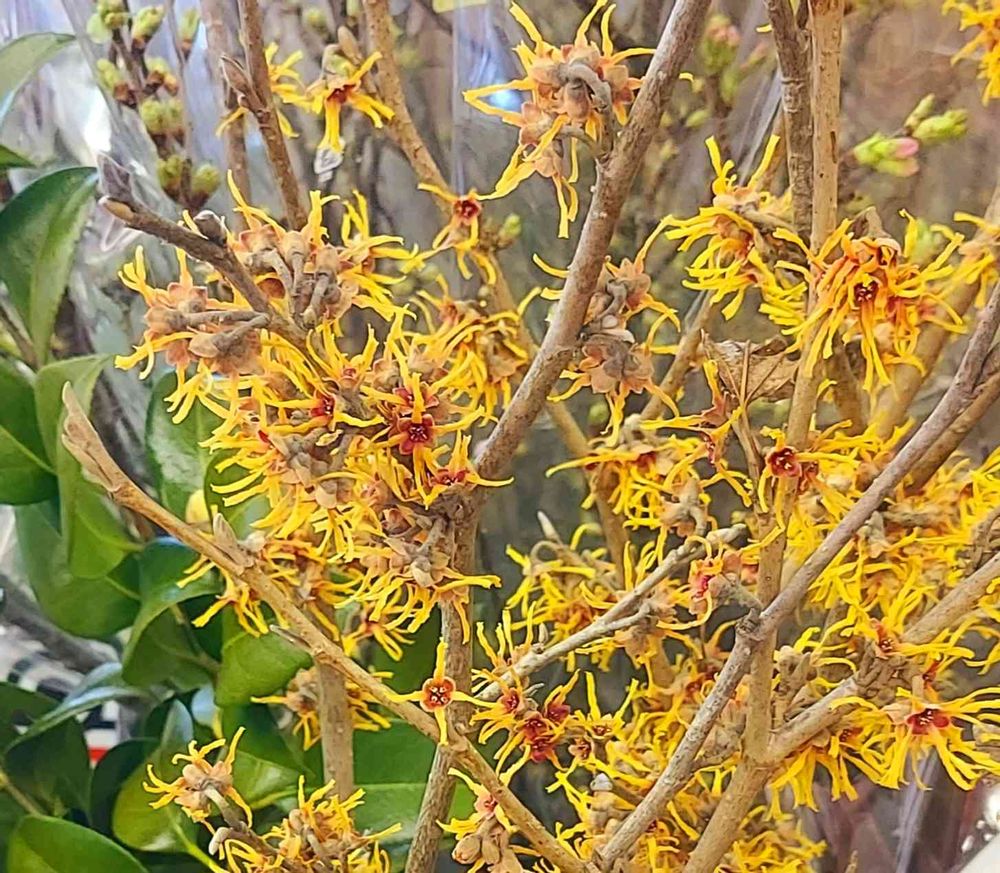 こんばんは😃🌃我が庭のマンサクは,今年遅いなと毎日見回りしていました。ふと見上げると、満開に数日前暖かい日が続いたからと納得しました。好きな花のひとつです。