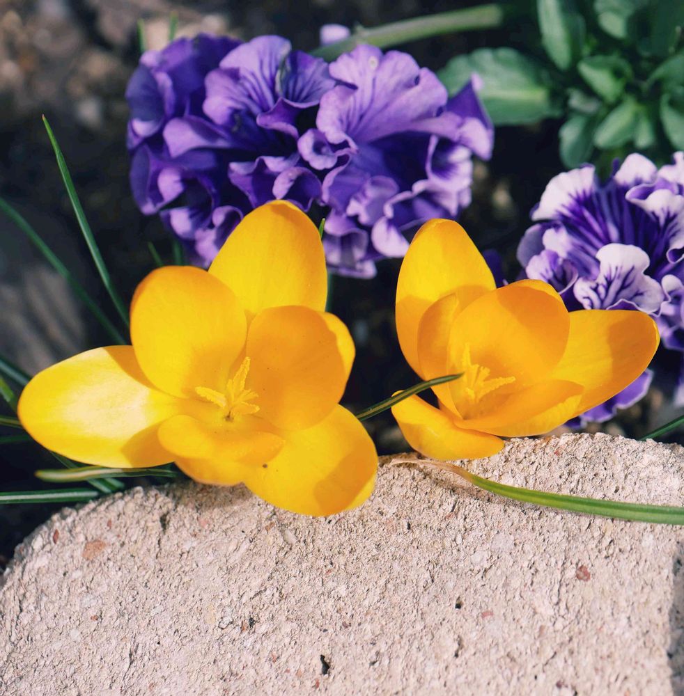 ①4年目の「クロッカス 混合球根 5球」は、黄色、紫でした。まずは黄色が一番乗り。花壇の縁のブロックにピッタリくっついて咲いています😉