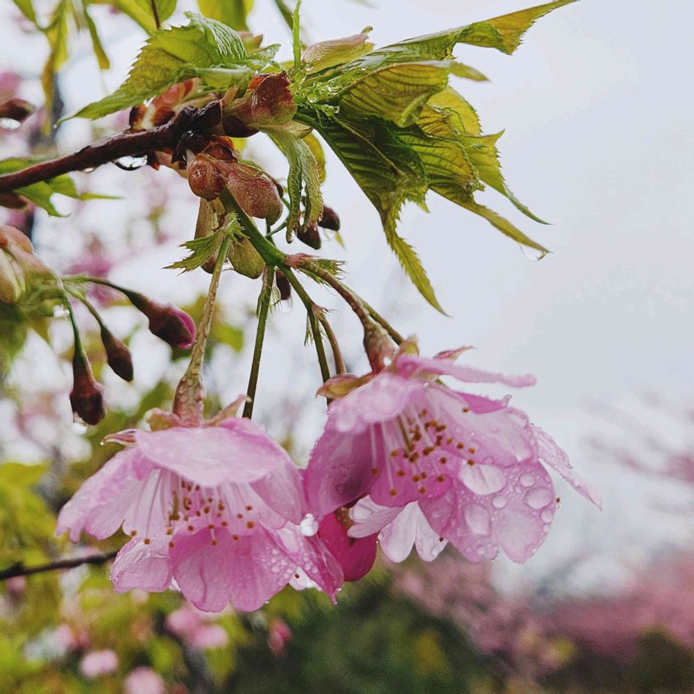 ①🌸🌿柔らかな葉が伸び始めた河津桜にも冷たい雨が降り注いでいました。🌧️