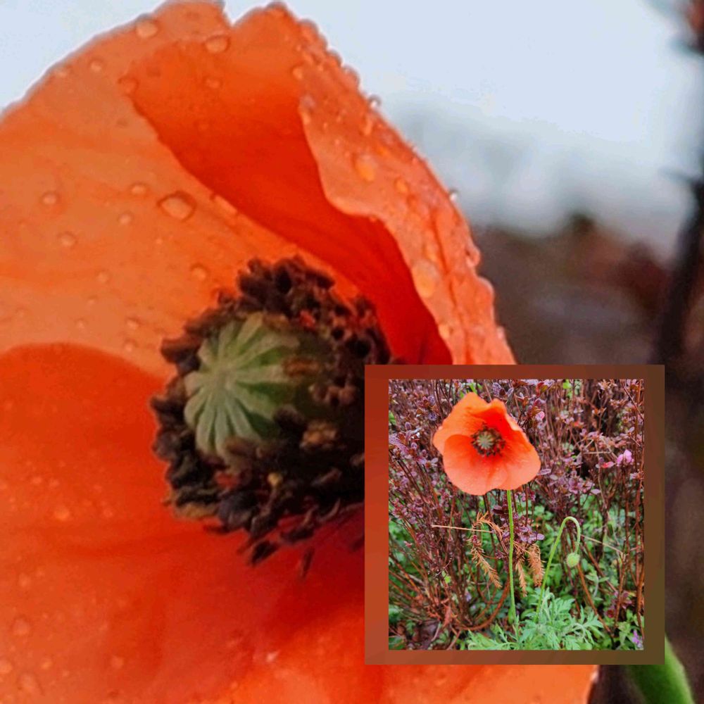 ②🧡🌿一本だけ咲いていた「ナガミノヒナゲシ(長実雛芥子)」も重い雨粒に花弁を押されて困った様子に見えました。🌧️