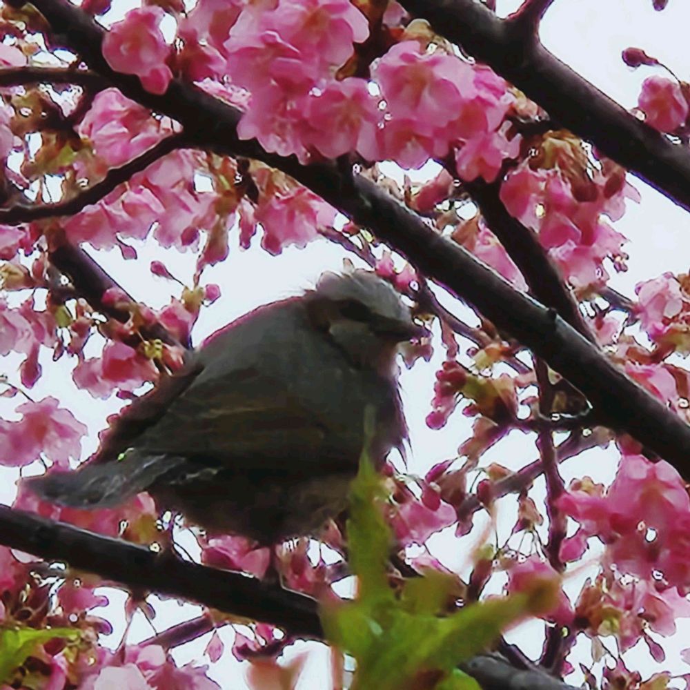 ☔雨で他の鳥さんが🌸蜜を吸いにやって来ないので、ヒヨドリ御一行様は貸し切り状態で、右の木🌸へ左の木🌸へと忙しそうに🌸蜜レストランをはしごしていました。🦅💕